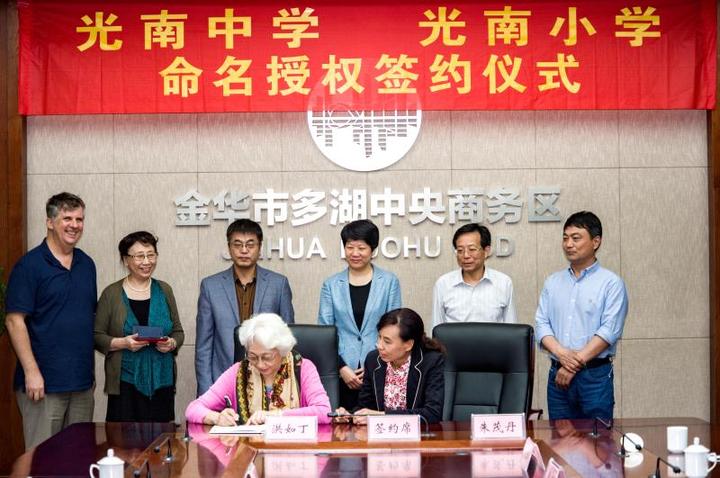4月4日,人民音樂(lè)家施光南先生的夫人洪如丁女士和金東區(qū)政府簽訂授權(quán)書,多湖初中、多湖小學(xué)分別更名為光南中學(xué)、光南小學(xué),并均由金華市外國(guó)語(yǔ)學(xué)校托管,光南中學(xué)將掛牌金外合作學(xué)校,光南小學(xué)將掛牌金外附屬小學(xué)。