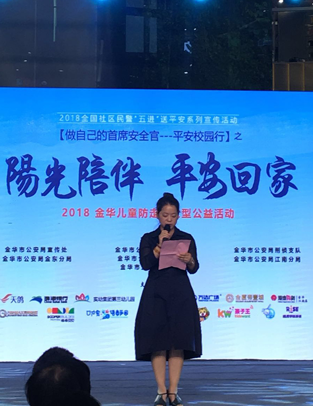 6月2日上午,由金華市公安局、金東區(qū)教育局主辦,金華市實驗幼兒園教育集團第三幼兒園、大象家長會承辦的“陽光陪伴 平安回家-2018金華兒童防走失大型公益活動” 在萬達廣場正式拉開帷幕。啟動儀式上,第三幼兒園園長倪美芬作為代表上臺致辭。