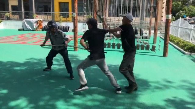 上午,當(dāng)孩子們?cè)诨顒?dòng)時(shí),演練開始。一名由教職工扮演的恐怖分子,強(qiáng)行闖入幼兒園,幼兒園第一時(shí)間拉起了警報(bào)。與此同時(shí),幼兒園護(hù)園隊(duì)迅速增援,與保安合力將“歹徒”降服,這時(shí)幼兒園宣布解除警報(bào)。