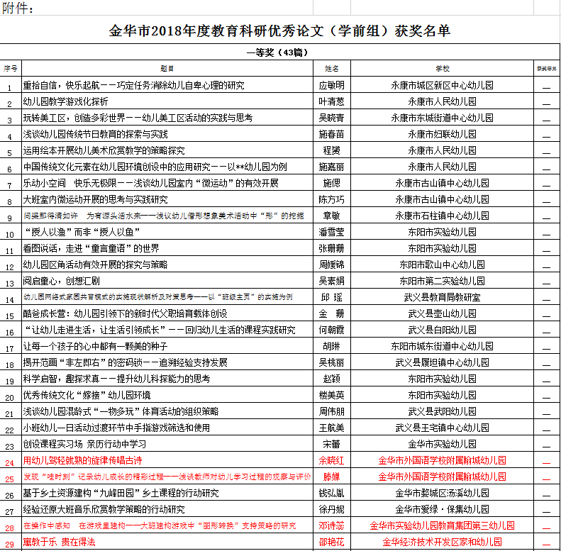 據(jù)金華教育網(wǎng)5月24日發(fā)布的金華市教育科學(xué)研究所《關(guān)于金華市2018年度教育科研優(yōu)秀論文、金華市第十三屆教育科研 “提質(zhì)減負(fù)”專題優(yōu)秀論文評(píng)比結(jié)果公示的通知》,公司下屬的金華市實(shí)驗(yàn)幼兒園教育集團(tuán)收獲頗豐,共有19篇論文在此次評(píng)比中獲獎(jiǎng),其中,八園的余曉紅、滕嬋,三園的鄧詩(shī)蕊和九園的邵艷花榮獲一等獎(jiǎng)(全市共43篇一等獎(jiǎng)?wù)撐模碛?位老師的論文獲得二等獎(jiǎng)、12位老師的論文獲得三等獎(jiǎng)。
