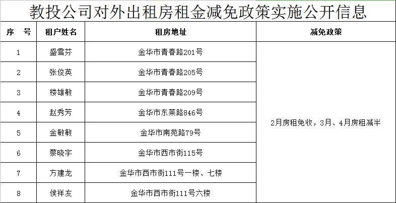 根據(jù)省、市及市社發(fā)集團(tuán)相關(guān)通知要求,現(xiàn)將市教投公司出租房租金減免政策實(shí)施情況公開(kāi)如下: